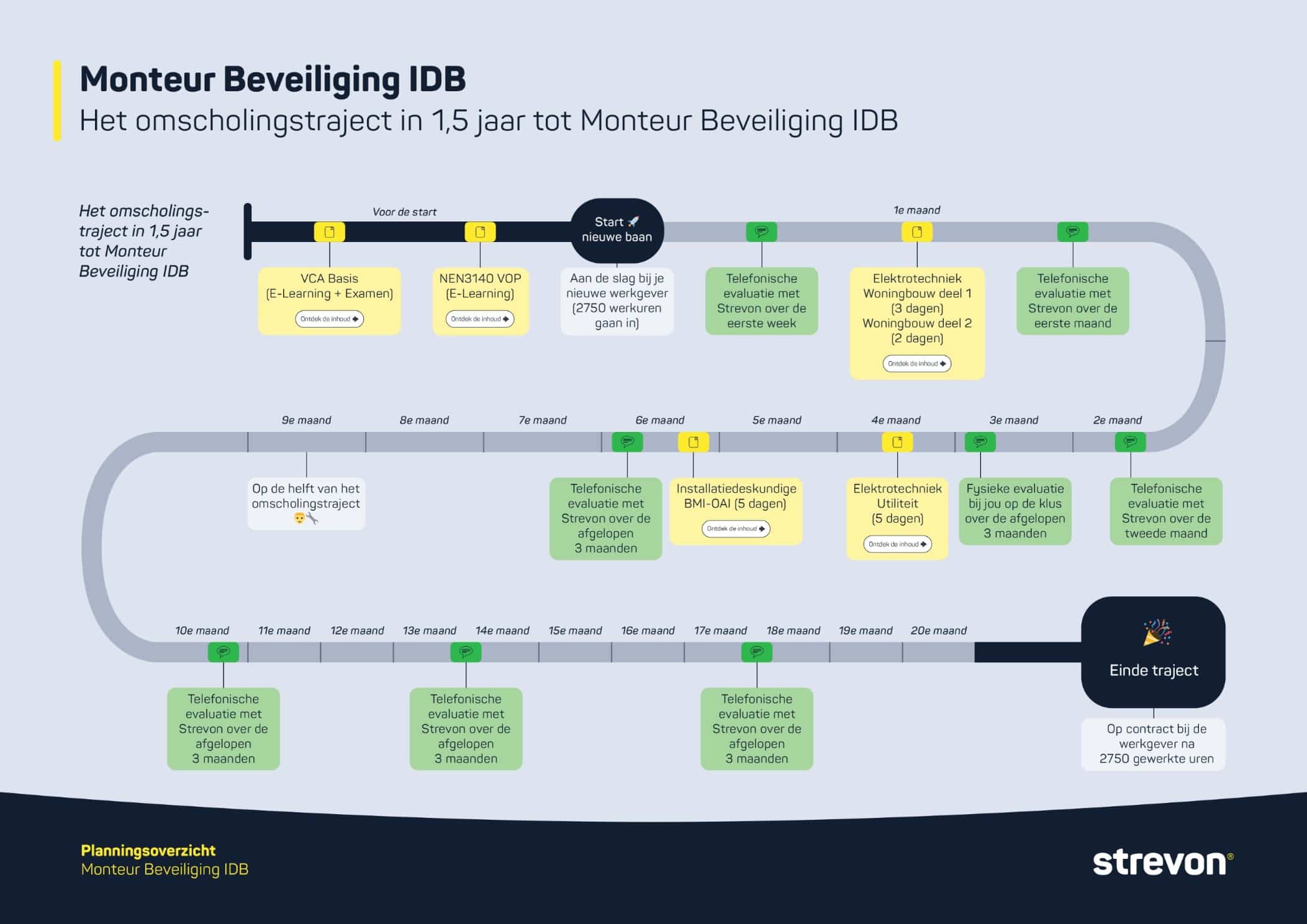 Bekijk hieronder een voorbeeld van ons omscholingstraject voor een monteur beveiliging IDB. De groene blokken geven de evaluatiemomenten met zij-instromers (dan hulpmonteurs) aan gedurende het 1,5 jaar durende traject.